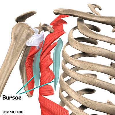 A is a fluid-filled sac that cushions body tissues from friction. A bursa sits between the two muscles of the scapula. There is also a bursa in the space between the serratus anterior muscle and the chest wall. When bursa sacs become inflamed, the condition is called bursitis.