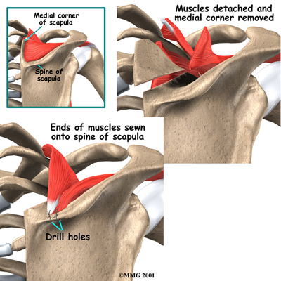 The tissues that attach muscles to the upper part of the scapula are carefully detached and moved out of the way. Then the surgeon uses a special tool to: