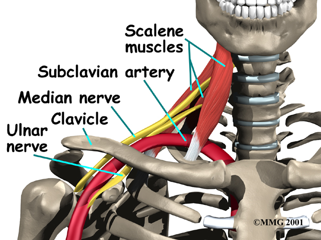 The travel between muscles in the neck called the scalene muscles and over the top of the rib cage. The thoracic outlet is this opening between the scalene muscles and the rib cage. The nerves and blood vessels then go under the collarbone (also known as the clavicle), through the armpit (the axilla), and down the arm to the hand.