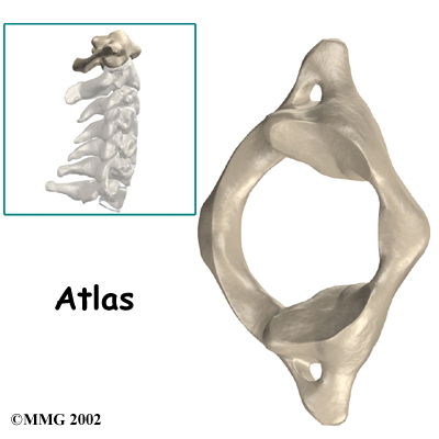 The base of the skull sits on top of C1, also called the atlas. Two thickened bony arches form a large hole through the center of the atlas. The opening is large because the spinal cord is wider where it first exits the brain and skull. Compared to other vertebrae, the atlas also has much wider bony projections pointing out to each side.