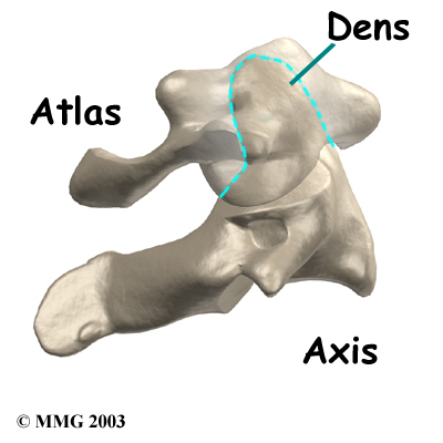 The atlas sits on top of the C2 vertebra. The C2 is called the axis. The axis has a large bony knob on top, called the dens. The dens points up and fits through a hole in the atlas. The joints of the axis give the neck most of its ability to turn to the left and right.