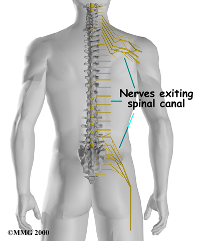 The spinal cord travels down from the brain through the spinal column. Two large nerves branch off the spinal cord from each vertebra, one on the left and one on the right. The nerves pass through the neural foramina. These spinal nerves group together to form the main nerves that go to the limbs and organs. The nerves that come out of the cervical spine go to the arms and hands.