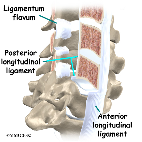 Ligaments are strong connective tissues that attach bones to other bones. (Connective tissues are networks of fiber that hold the cells of the body together.) Several long ligaments connect on the front and back sections of the vertebrae. The anterior longitudinal ligament runs lengthwise down the front of the vertebral bodies. Two other ligaments run full length within the spinal canal. The posterior longitudinal ligament attaches on the back of the vertebral bodies. The ligamentum flavum is a long elastic band that connects to the front surface of the lamina bones.