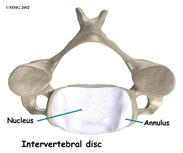 An intervertebral disc is made of two parts. The center, called the nucleus, is spongy. It provides most of the shock absorption in the spine. The nucleus is held in place by the annulus, a series of strong ligament rings surrounding it.