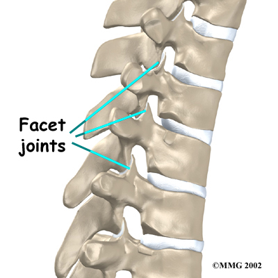 Between the vertebrae of each spinal segment are two facet joints. The facet joints are located on the back of the spinal column. There are two facet joints between each pair of vertebrae, one on each side of the spinous process. The alignment of the facet joints of the thoracic spine allows freedom of movement as you twist, move back and forth, or lean side to side.