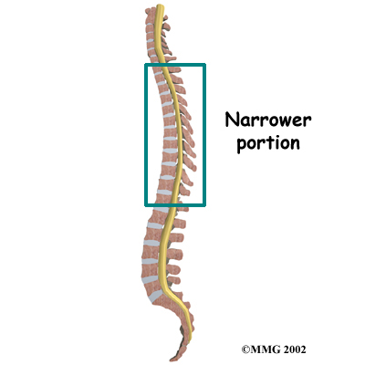 The spinal cord travels down from the brain through the spinal column. In the thoracic spine, the spinal canal is narrower than in the rest of the spine, so there is very little extra space for the spinal cord as it passes through this area. Due to this, thoracic spine injuries involving the spinal cord are often more problematic than in other areas of the spine.