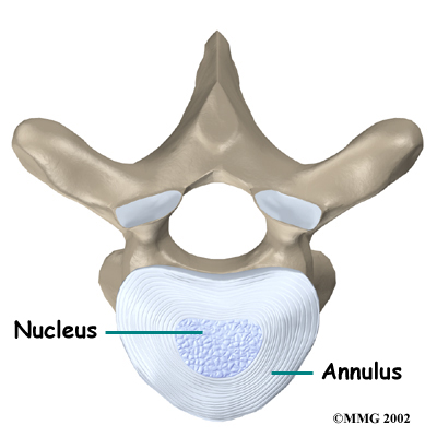 An intervertebral disc is made up of two parts. The center, called the nucleus pulposus, is spongy. It provides most of the shock absorption in the spine. The nucleus is held in place by the annulus, a series of strong ligament rings surrounding the nucleus. If there is wear and tear or injury to the annulus, the inner nucleus can bulge out causing pain and can also irritate the nerves located nearby.