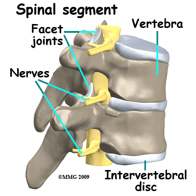 A good way to understand the anatomy of the thoracic spine is to visualize one spinal segment in relation to the anatomy described above. Each spinal segment includes two vertebrae separated by an intervertebral disc, the nerves that leave the spinal column at each vertebra, and the small facet joints that link each level of the spinal column.
