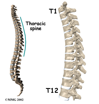 The section of spine from below the neck to the bottom of the rib cage is called the thoracic spine. From the side, the thoracic spine appears slightly rounded. Its shape is like the letter "C" with the opening of the “C” facing the front of the body. This normal curve is called a kyphosis. With an excessive kyphosis, the thoracic spine takes on a hunchbacked appearance.