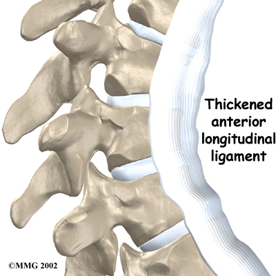 A long ligament called the anterior longitudinal ligament connects on the front of the vertebral bodies. This ligament typically thickens in patients with Scheuermann's disease and adds to the forward pull on the spine, producing more wedging and kyphosis.