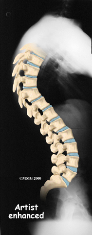 A healthy human spine has three gradual curves. From the side, the neck and low back curve gently inward. This is called a lordosis. The thoracic kyphosis (outward curve) gives the mid back its slightly rounded appearance. These normal curves help the spine absorb forces from gravity and daily activities, such as lifting.
