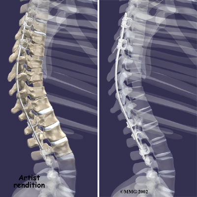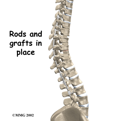 For this part of the combined fusion surgery the surgeon makes an incision over the back of the spine. The skin and muscles are spread apart then strips of bone graft are laid across each vertebra to be fused. Long rods are inserted along the sides of the spine. The rods have hooks attached on both ends. Wire is wrapped between the top and bottom hooks. Tightening the wires causes the spine to straighten. The rods help hold the spine steady as the bone grafts heal. The rods are usually left in permanently.