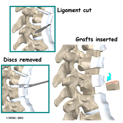 Next a section of the anterior longitudinal ligament is cut. This makes it easier to straighten the hunched spine. The intervertebral discs in the problem area are taken out, and the spaces between the wedged vertebrae are filled with bone graft. One method is to take a graft of bone from the pelvis and tamp it into the place of each removed disc. This requires another incision over one side of the pelvis. A second method is to grind up the piece of rib that was removed and place it in the disc spaces.