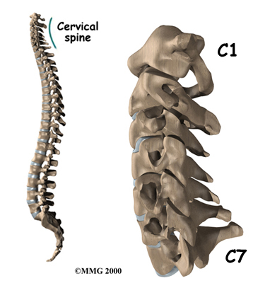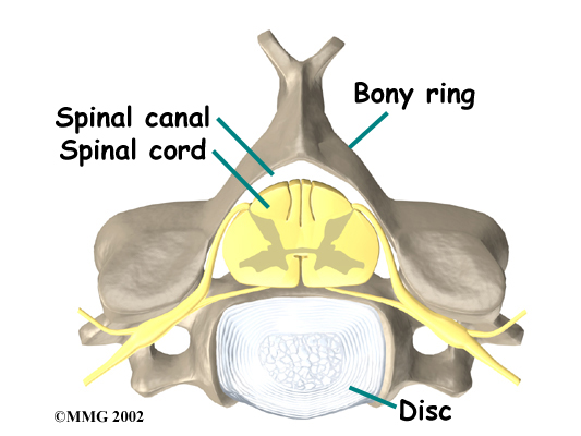 The spine is made of a column of bones. Each bone, or vertebra, is formed by a round block of bone, called a vertebral body. The spinal canal is a hollow tube formed by the bony rings of all the vertebrae. The spinal canal surrounds and protects the spinal cord within the spine. There are seven vertebrae in the neck that form the area known as the . The vertebrae are separated by intervertebral discs.