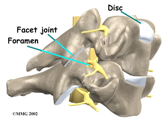 Wear and tear from repeated stresses and strains on the neck can cause a spinal disc to begin to collapse. As the space between the vertebral bodies shrinks, the opening around the nerve root narrows. This squeezes the nerve. The nerve root is further squeezed in the foramen when the facet joint lining the outer edge of the foramen becomes inflamed and enlarged as a result of the same degenerative changes.