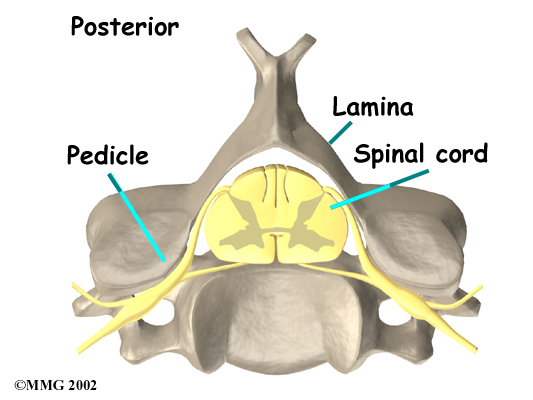 urgeons perform this procedure through the back of the neck. This is known as the posterior neck region. It includes the parts that make up the bony ring around the spinal cord (the .)