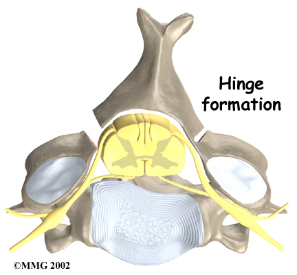 Surgeons have found that complete removal of the laminae loosens the facet joints that connect the back of the spine. This can cause the spine to tilt forward. To avoid this, a hinge can be formed by only cutting partially through the lamina on one side. A second cut is made all the way through the other lamina. This edge is then lifted away from the spinal cord, and the other edge acts like a hinge. The hinged side forms a bone union, which holds the opposite side open and keeps pressure off the spinal cord.