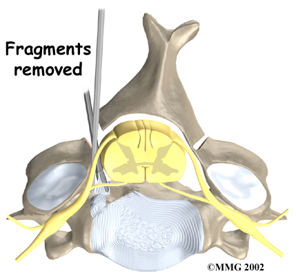 Small cutting instruments may be used to carefully remove soft tissues near the spinal cord. Then the surgeon takes out any small disc fragments and scrapes off nearby bone spurs. In this way, additional tension and pressure are taken off the spinal cord.