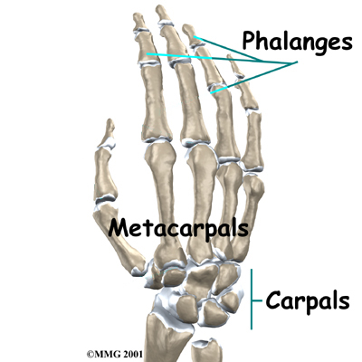 The carpal bones connect the , the radius and the ulna, to the bones of the hand. The metacarpal bones are the long bones that lie underneath the palm. The metacarpals attach to the phalanges, which are the bones in the fingers and thumb.