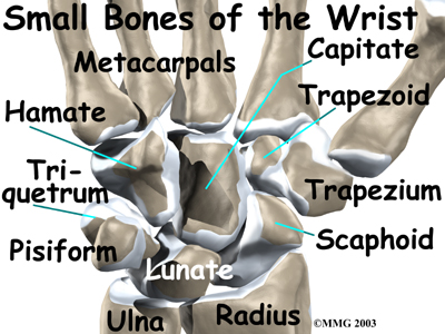The wrist is made of eight separate small bones, called the carpal bones. The lunate is one of these bones.