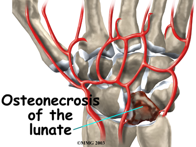 Kienbock's disease is a condition in which one of the small bones of the wrist loses its blood supply and dies, causing pain and stiffness with wrist motion. In the late stages of the disease, the bone collapses, shifting the position of other bones in the wrist. This shifting eventually leads to degenerative changes and osteoarthritis in the joint. While the exact cause of this uncommon disease isn't known, a number of treatment options are available.