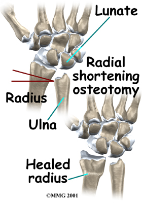 If your surgeon suggests a radial shortening osteotomy, then the goal is to shorten the bone that is too long. A radial osteotomy is sometimes preferred because the bone just heals better. The distal end of the radius near the wrist joint is larger than the ulna with a better blood supply. This means that it heals faster and more reliably.