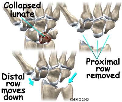 In stage four (late-stage) Kienbock's disease, surgeons focus on treating the wrist osteoarthritis that results when the lunate collapses and dies. One surgical option at this stage is proximal-row carpectomy. Carpectomy means excision (removal) of one or more of the carpal bones. The wrist is made up of two rows of carpal bones, four in each row. The lunate is in the proximal row (the row closest to the forearm). When the lunate has collapsed, but the wrist joint is not terribly arthritic, the four carpal bones of the proximal row may simply be removed. This allows the distal row (the other four bones) to slide down a bit and to begin moving against the forearm bones instead.