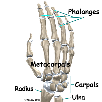 The wrist is made up of eight separate small bones, called the . The carpal bones connect the two bones of the forearm, the radius and the ulna, to the bones of the hand. The metacarpal bones are the long bones that lie underneath the palm. The metacarpals attach to the phalanges, which are the bones in the fingers and thumb.