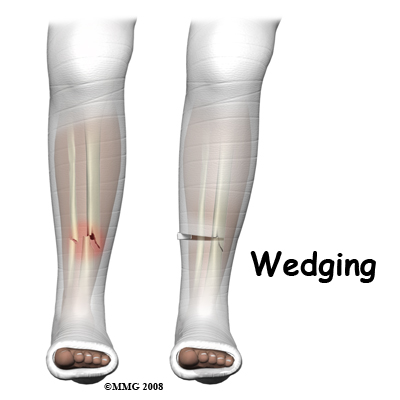 If the fracture has moved, it may be possible to correct the position by . This involves cutting the cast three-fourths the way around at the level of the fracture leaving a hinge of intact cast on the convex side of the deformity. The leg can then be straightened and a wedge inserted into the opening in the cast on the concave side to hold the cast - and the bones - in the new position. Once x-rays have confirmed that the new position is acceptable, more plaster is applied over the cast to make it rigid once again.