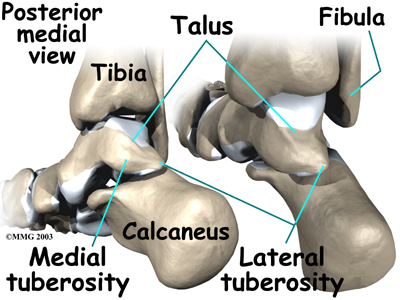 Two small bony bumps, called , project from the back of the talus, one on the inside (medial) edge and one on the outer (lateral) edge.