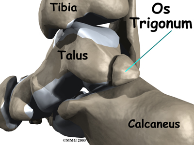 In some people the lateral tuberosity is not united to the talus. The separate piece of bone is called an . This separation of the os trigonum from the talus is usually not a fracture. About 15 percent of people have an os trigonum. An os trigonum sometimes causes problems of impingement in the back of the ankle.