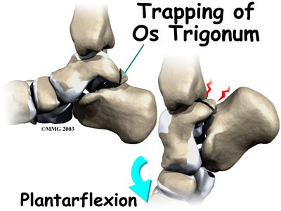 If the doctor believes that pinching in the back of the ankle is from an os trigonum, a numbing medication may be injected into this area. If it feels better, the problem is a posterior impingement from the os triogonum. If the pain doesn't change, the problem could be in the tendon that runs along the inside edge of the os trigonum.