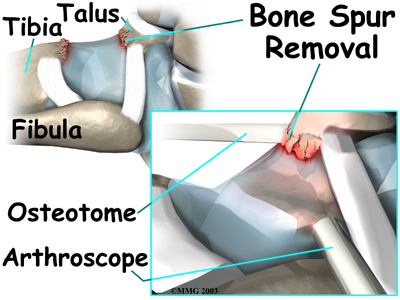 Small bone spurs on the tibia or talus are . If the spurs are large, the surgeon may decide to create a new incision over or next to the spur. This allows a special instrument, called an osteotome, to be inserted. The surgeon uses the osteotome to carefully remove these larger bone spurs.