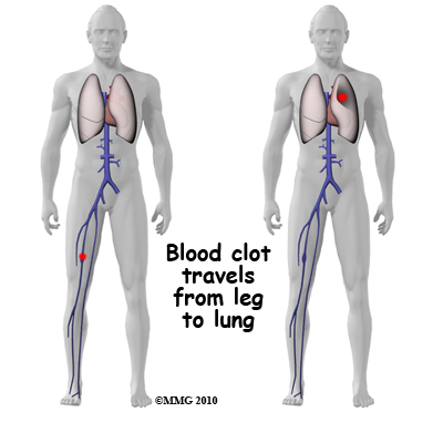 Thrombophlebitis, sometimes called deep venous thrombosis (DVT), can occur after any operation, but is more likely to occur following surgery on the hip, pelvis, or knee. DVT occurs when blood clots form in the large veins of the leg. This may cause the leg to swell and become warm to the touch and painful. If the blood clots in the veins break apart, they can travel to the lung, where they lodge in the capillaries and cut off the blood supply to a portion of the lung. This is called a pulmonary embolism (pulmonary means lung, and embolism refers to a fragment of something traveling through the vascular system.) Most surgeons take preventing DVT very seriously. There are many ways to reduce the risk of DVT, but probably the most effective method is to get you moving as soon as possible after the surgery. Two other commonly used preventative measures include: