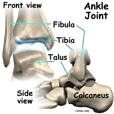 The ankle joint is made up of three bones: the lower end of the tibia (shinbone), the fibula (the small bone of the lower leg), and the talus (the bone that fits into the socket formed by the tibia and fibula). The talus sits on top of the calcaneus (the heelbone).