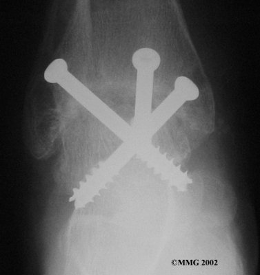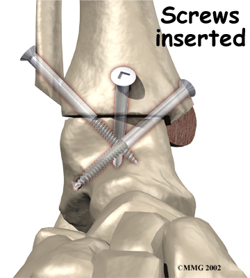 It is important when the surfaces are removed that the angles of the cut surfaces are correct. When the tibia is brought against the talus, the foot should be at a right angle to the lower leg. Once the cuts are made the bones must be held in place while they fuse. This can be done using large metal screws and metal plates if necessary. The screws are usually under the skin and are not removed unless they begin to rub and cause pain.