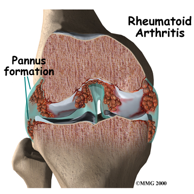 The second process causing the problems in RA results from the ongoing or repetitive synovitis. The blood cells and the swollen membranes of the synovium release chemicals into the synovial fluid (the lubricating fluid of the joint) that can break down or damage the tissues of the joint. This breakdown can cause permanent damage to the cartilage, bones, ligaments, and tendons inside and around the joint. The structural damage usually happens in the first to third year of the disease. The synovitis can come and go, but the structural deterioration progresses and results in permanent damage. As a result, the joint becomes chronically painful and very difficult to move.
