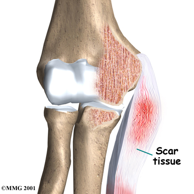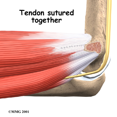 The flexor tendon is then cut where it connects to the medial epicondyle. The surgeon splits the tendon and takes out any extra scar tissue. Any bone spurs found on the medial epicondyle are removed. (Bone spurs are pointed bumps that can grow on the surface of the bones.) Some surgeons suture the loose end of the tendon to the nearby fascia tissue. (Fascia tissue covers the muscles and organs throughout your body.)