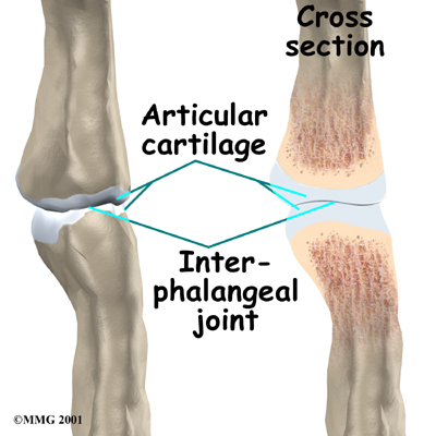 Injury to a joint, such as a bad sprain or fracture, can cause . An injury to any of the joints of the fingers, even if it does not injure the articular cartilage directly, can alter how the joint works. After a fracture, the bone fragments may heal in slightly different positions. This may make the joints line up differently. When an injury changes the way the joint lines up and moves, force can start to press against the surface of the articular cartilage. This is similar to how a machine that is out of balance wears out faster.