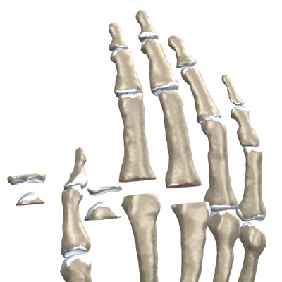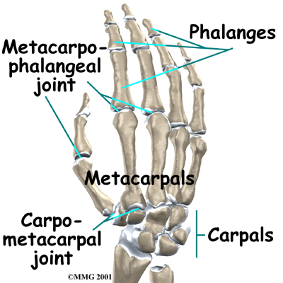 The finger joints work like hinges when they bend and straighten. The main knuckle joint is the metacarpophalangeal joint (MCP joint). It is formed by the connection of the metacarpal bone in the palm of the hand to the finger bone, or phalange. Each finger (the thumb is not termed a finger) has three phalanges, separated by two interphalangeal joints (IP joints). The one closest to the MCP joint (knuckle) is called the proximal IP joint (PIP joint). The joint near the end of the finger is called the distal IP joint (DIP joint).