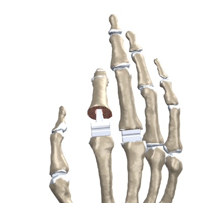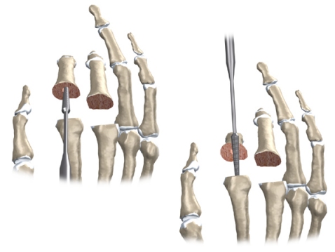 The surgeon then sizes the stem of the prosthesis to ensure a snug fit into the hollow bone marrow space of the bone. The prosthesis is inserted into the ends of both finger bones.