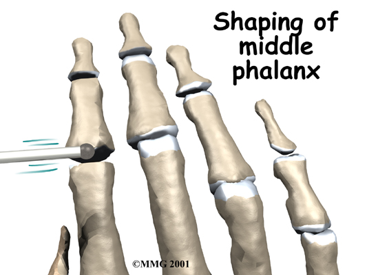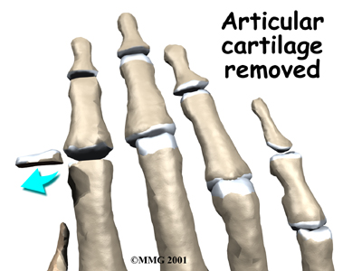 An incision is made on the back part of the finger over the surface of the joint that is to be fused. Special care is taken not to damage the nearby nerves going to the finger. The joint capsule surrounding the finger joint is then opened so that the surgeon can see the joint surfaces. The articular cartilage is removed from both joint surfaces to leave two surfaces of raw bone. The bottom of the phalange is hollowed with a special tool to form a socket. The other surface is shaped into a rounded cone that fits inside the socket.