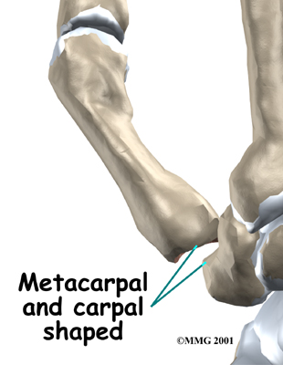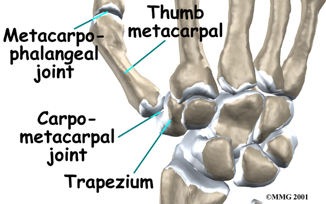 The carpometacarpal joint of the thumb (CMC joint) is where the metacarpal bone of the thumb attaches to the trapezium bone of the wrist. This joint is sometimes referred to as the basal joint of the thumb as it is the joint closest to the bottom of the hand. The CMC is the joint that allows you to move your thumb into your palm, a motion called opposition.