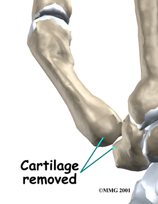An incision is made on the side of the thumb just over the CMC joint. Special care is taken not to damage the nearby nerves going to the thumb. The joint capsule surrounding the CMC joint is then opened so that the surgeon can see the joint surfaces. The articular cartilage is removed from both joint surfaces to leave two surfaces of raw bone. A special tool is used to hollow the end of the thumb metacarpal to form a socket. The surface of the trapezium is shaped into a rounded cone that fits into the socket inside the thumb metacarpal.