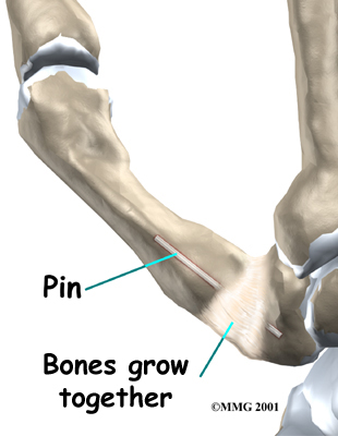 The soft tissues over the joint are then sewn back together. The forearm and hand are placed in a cast until the bones completely fuse together. This takes about six weeks.