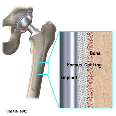 An uncemented prosthesis bears a fine mesh of holes on the surface that allows bone to grow into the mesh and attach the prosthesis to the bone.
