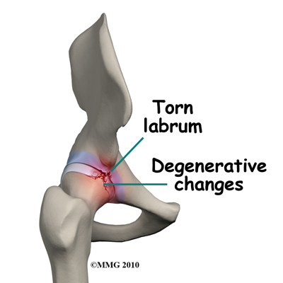 The gluteus maximus is the largest of three gluteal muscles of the buttocks. The gluteus maximus muscle spans the side of the hip and joins to the iliotibial band. The iliotibial band is a long tendon that passes over the bursa on the outside of the greater trochanter. It runs down the side of the thigh and attaches just below the outside edge of the knee. The other two buttocks muscles, the gluteus medius and the gluteus minimus, attach to the greater trochanter. These muscles are known as abductors because they function to pull the lower leg away from the body; a motion that is called abduction. These muscles can be torn where they attach to the greater trochanter causing pain and weakness as well as a snapping sensation. The acetabular labrum is a fibrous rim of cartilage around the hip socket that is important in normal function of the hip. It helps keep the head of the femur (thigh bone) inside the acetabulum (hip socket). It provides stability to the joint.