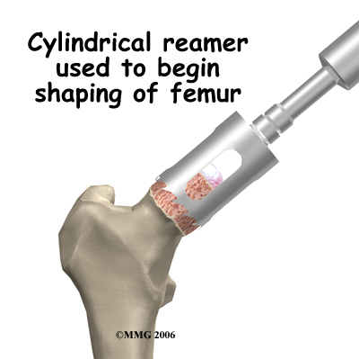 The operation begins by making an incision in the side of the thigh. This allows the surgeon to see both the femoral head and the acetabulum (or socket). The femoral head is then dislocated out of the socket. Special powered instruments are used to the bone of the so that the new metal surface will fit snugly on top of the bone.