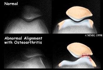 Diagnosing problems with the patella can be confusing. The symptoms can be easily confused with other knee problems, because the symptoms are often similar. In these cases, other tests, such as magnetic resonance imaging (MRI), may be suggested. The MRI machine uses magnetic waves rather than X-rays to show the soft tissues of the body. This machine creates pictures that look like slices of the knee. Usually, this test is done to look for injuries, such as tears in the menisci or ligaments of the knee. Recent advances in the quality of MRI scans have enabled doctors to see the articular cartilage on the scan and determine if it is damaged. This test does not require any needles or special dye and is painless. In some cases, arthroscopy may be used to make the definitive diagnosis when there is still a question about what is causing your knee problem. Arthroscopy is an operation that involves placing a small fiber-optic TV camera into the knee joint, allowing the surgeon to look at the structures inside the joint directly. The arthroscope allows your doctor to see the condition of the articular cartilage on the back of your patella. The vast majority of patellofemoral problems are diagnosed without resorting to surgery, and arthroscopy is usually reserved to treat the problems identified by other means. SurgeryIf nonsurgical treatment fails to improve your condition, surgery may be suggested. The procedure used for patellofemoral problems varies. In severe cases a combination of one or more of the following procedures may be necessary. Arthroscopic Method Arthroscopy is sometimes useful in the treatment of patellofemoral problems of the knee. Looking directly at the articular cartilage surfaces of the patella and the femoral groove is the most accurate way of determining how much wear and tear there is in these areas. Your surgeon can also watch as the patella moves through the groove, and may be able to decide whether or not the patella is moving normally. If there are areas of articular cartilage damage behind the patella that are creating a rough surface, special tools can be used by the surgeon to smooth the surface and reduce your pain. This procedure is sometimes referred to as shaving the patella. Cartilage Procedure In more advanced cases of patellar arthritis, surgeons may operate to repair or restore the damaged cartilage. The type of surgery needed for articular cartilage is based on the size, type, and location of the damage. Along with surgical treatment to fix the cartilage, other procedures may also be done to help align the patella so less pressure is placed on the healing cartilage. Related Document: Active Therapeutic Solutions Guide to Articular Cartilage Problems of the Knee Lateral Release If your patella problems appear to be caused by a misalignment problem, a procedure called a lateral release may be suggested. This procedure is done to allow the patella to shift back to a more normal position and relieve pressure on the articular cartilage. In this operation, the tight ligaments on the outside (lateral side) of the patella are cut, or released, to allow the patella to slide more towards the center of the femoral groove. These ligaments eventually heal with scar tissue that fills in the gap created by the surgery, but they no longer pull the patella to the outside as strongly as before the surgery. This helps to balance the quadriceps mechanism and equalize the pressure on the articular cartilage behind the patella. Ligament Tightening Procedure In some cases of severe patellar misalignment, a lateral release alone may not be enough. For problems of repeated patellar dislocations, the surgeon may also need to realign the quadriceps mechanism. In addition to the lateral release, the tendons on the inside edge of the knee (the medial side) may have to be tightened as well. Bony Realignment If the misalignment is severe, the bony attachment of the patellar tendon may also have to be shifted to a new spot on the tibia bone. Remember that the patellar tendon attaches the patella to the lower leg bone (tibia) just below the knee. By moving a section of bone where the patellar tendon attaches to the tibia, surgeons can change the way the tendon pulls the patella through the femoral groove. This is done surgically by removing a section of bone where the patellar tendon attaches on the tibia. This section of bone is then reattached on the tibia closer to the other knee. Usually, the bone is reattached onto the tibia using screws. This procedure shifts the patella to the medial side. Once the surgery heals, the patella should track better within the center of the groove, spreading the pressure equally on the articular cartilage behind the patella. View animation of the bony realignment procedure