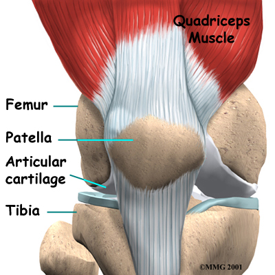 The patella, or kneecap, is the moveable bone on the front of the knee. It is wrapped inside a tendon that connects the large muscles on the front of the thigh, the quadriceps muscles, to the lower leg bone. The surface on the back of the patella is covered with articular cartilage. It glides within a groove on the front of the femur.